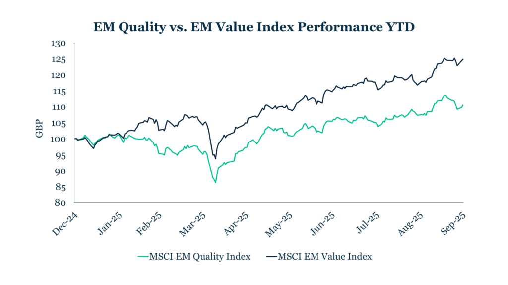Other positive macro news for emerging markets comes in the form of the Federal Reserve’s first interest rate cut of the year this September, with rates now targeted at 4-4.25%. Fed officials also hinted that further rate cuts would follow in the remainder of the year. Lower US interest rates tend to benefit emerging markets by making lower yielding developed market assets less attractive, potentially prompting investors to seek higher returns in EMs some of which are also experiencing moderating local inflation, lower public debts and higher real rates. This can boost foreign direct investment and support EM asset prices. However, the impact is uneven, as greater risk appetite and lower US yields cannot fully offset weak macroeconomic conditions or poor corporate fundamentals in certain markets. Nevertheless, the continuation of the downward trajectory of global rate cuts should be positive for emerging markets overall.