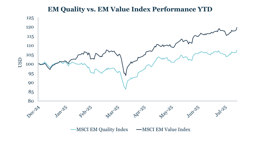 In Q2, we began to see early signs of a potential reversal, indicating that recent portfolio headwinds may have been cyclical. This view is cautiously supported by improving macro conditions — including easing tariff volatility, momentum in AI and technology, further interest rate cuts, and a declining USD — as well as country-specific catalysts in India, Taiwan, Korea, and Brazil. While these factors could provide a more supportive backdrop, we expect any recovery to become clearer over the course of next year as these trends gradually come into play.