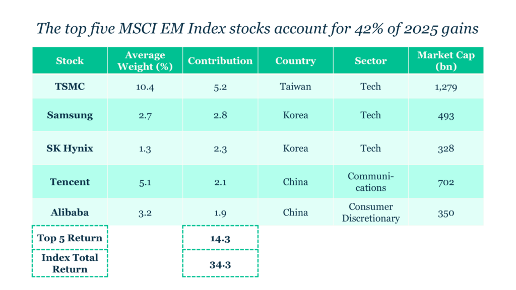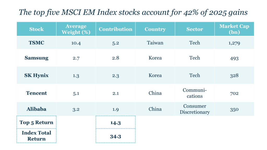 While emerging markets have delivered strong headline returns this year, dispersion beneath the surface has been significant. With valuation spreads at elevated levels and earnings revisions diverging meaningfully by country, sector and company, passive exposure increasingly reflects index concentration rather than the breadth of opportunity available.