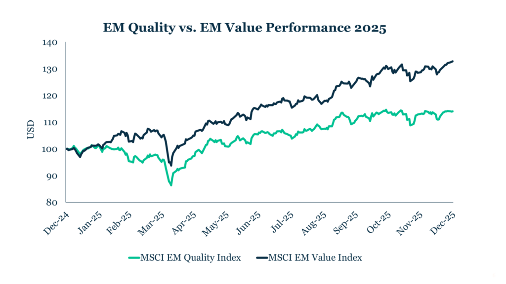 At year end, emerging markets were trading at a 38% discount on a P/E basis and a 61% discount on a P/B basis relative to developed markets. These valuation gaps are particularly pronounced in the sectors we focus on, such as technology and consumer discretionary. Importantly, the attractive discounts noted above are also increasingly evident across quality stocks, extending beyond traditional value segments.