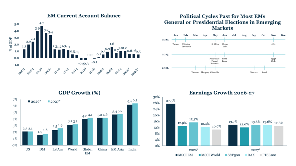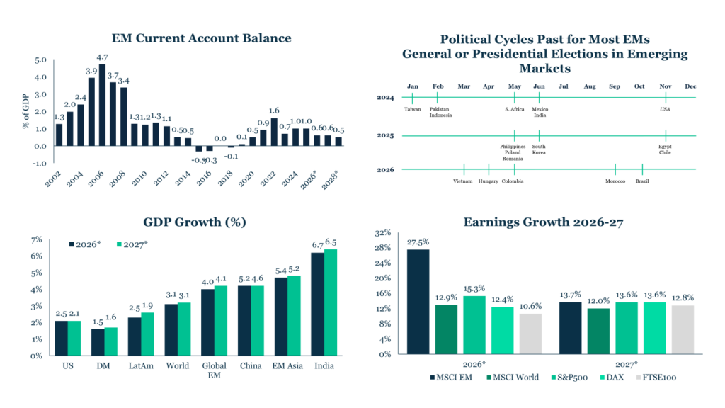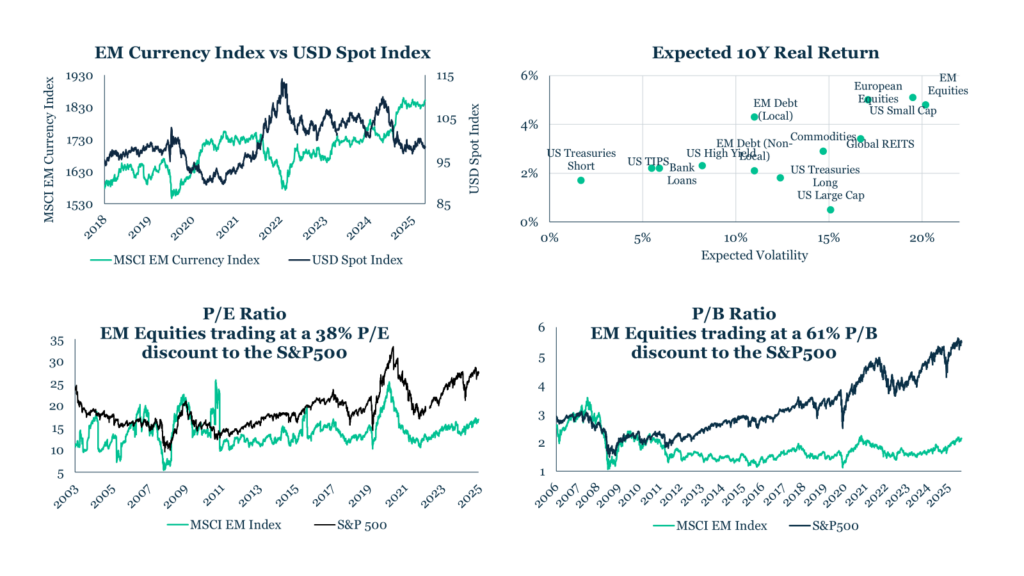 The Federal Reserve’s expected rate cuts this year further enhance the outlook, as lower US yields generally push investors toward higher-return emerging market assets—particularly as many EMs benefit from moderating inflation and higher real rates themselves. While effects may vary across countries, the global easing cycle provides a broadly supportive backdrop for EM performance.