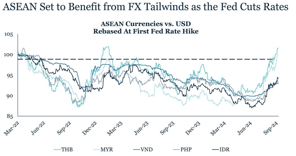 One of the main sources of volatility this year has been the Federal Reserve’s decisions regarding interest rate cuts. While the pace of future cuts and any unexpected employment or inflation data may continue to cause market fluctuations, the direction is now clear with the first cut behind us. Our focus, however, remains on the impact of these rate cuts on emerging markets rather than the short-term volatility around Fed meetings. With rates trending lower, as demonstrated by the Fed’s half-point cut on 18 September, we believe emerging markets are poised to benefit. Lower interest rates in advanced economies typically weaken the dollar, which in turn supports EM currencies and eases the burden of dollar-denominated debt.
