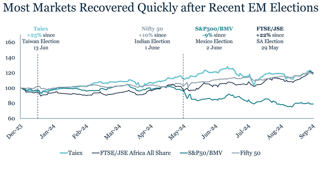 The global election year, seeing more than 60 countries and two billion people participating in elections4, has provided an additional source of volatility as uncertainty over new governments and policy directions incites investors’ fear of the unknown. However, most of the elections in emerging markets this year have not led to significant long-term spikes in volatility as the results have largely maintained the status quo in government policy. While initial declines in equity markets were mostly brief and quickly reversed (Mexico being one exception) some elections have even reduced local market volatility, with South Africa being a good example.