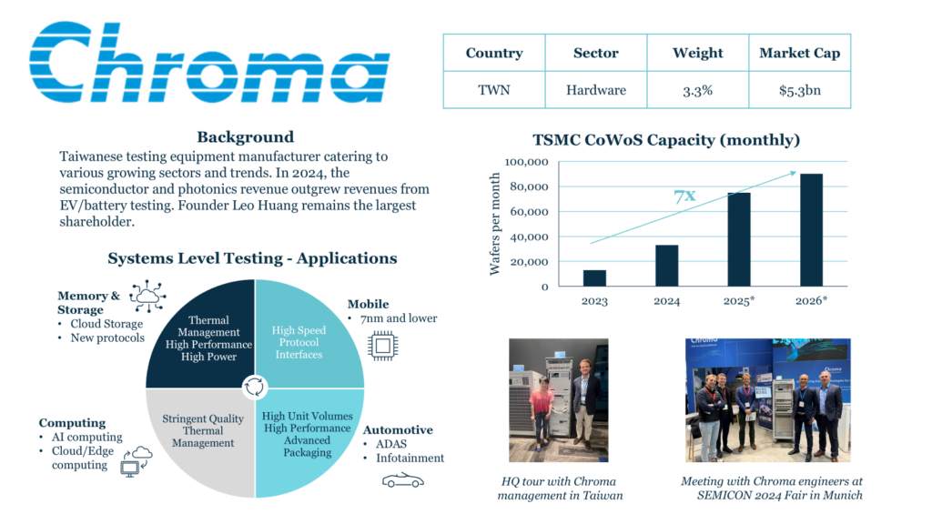 During these conversations and in follow-ups afterwards, we received positive updates from several companies in our portfolio that confirm our outlook. For example, Elite Material, a leading producer of semiconductor materials, is preparing to supply its upgraded M8 material for a US cloud service provider’s ASIC (Application-Specific Integrated Circuit) in 2025, addressing the growing demand for AI processing and the need for customised solutions over NVIDIA’s GPUs (Graphics Processing Unit). Similarly, Chroma has developed a unique device for its foundry client’s advanced packaging processes, ensuring precise alignment of stacked chip components, an essential capability for manufacturing next-generation AI chips.