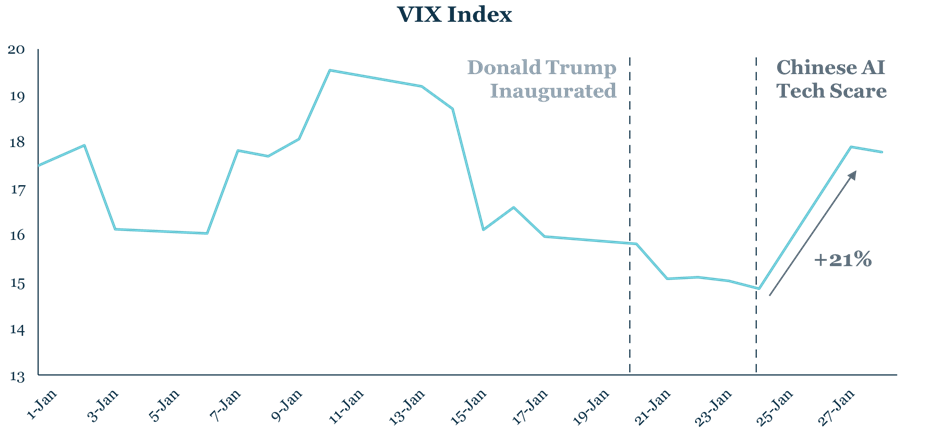 Yesterday, market volatility, measured by the VIX Index, jumped 21% from the previous trading day’s close. This spike was triggered by DeepSeek, a Chinese AI start-up, unveiling a large language model (LLM) reportedly built with just USD$6M, challenging the long-standing assumption that AI development requires vast amounts of expensive Nvidia chips. As a result, Nvidia’s share price dropped 17% on Monday with sell-offs reaching across U.S. big tech with other ‘Magnificent 7’ companies experiencing smaller, yet notable, declines.