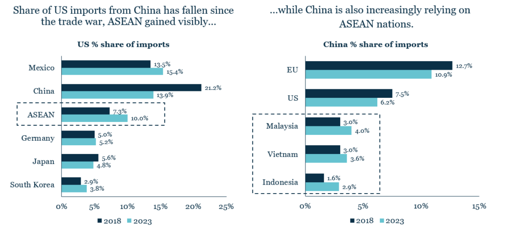 Donald Trump’s landslide victory and Republican control of Congress mark a pivotal shift for the US and global markets. While US equities and the dollar have strengthened in response, emerging markets face a more uncertain outlook due to Trump’s aggressive tariff rhetoric. Yet, as Einstein suggested, within difficulties lie opportunities. Countries like India, Indonesia and Vietnam, are already benefiting from the “China+1” strategy and appear well-positioned to attract new manufacturing investments. Their competitive labour markets, improving infrastructure and supportive government policies make them increasingly appealing, as companies seek to diversify supply chains and reduce dependency on China. At the same time, the US’s heavy reliance on imports, particularly from China, reduces the likelihood of sweeping tariffs, which could risk significant domestic disruption. Nevertheless, Trump’s track record and rhetoric on trade raises the possibility of bold policy shifts that may reshape global trade dynamics in the years to come.