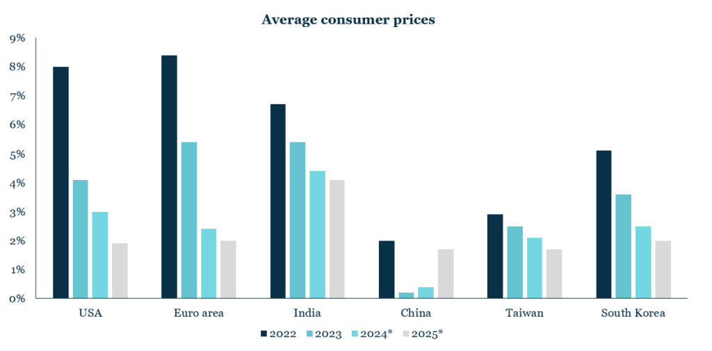 Amidst the turbulence, one of the more encouraging developments has been the ability of several developed and emerging markets to successfully steer towards what appears to be a soft landing, accompanied by the gradual (albeit occasionally uneven) normalisation of global inflation. While some fluctuations may still occur, the overall trend of easing inflation pressures, with only a few exceptions, seems clear.