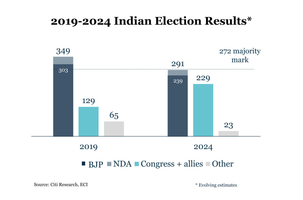 However, a coalition government does not spell the end for pro-business reforms. Many of Modi’s core allies have a strong pro-business track record in their respective provinces. For example, Chandrababu Naidu of the TDP, who served as Chief Minister of Andhra Pradesh (1995-2004, 2014-2019), prioritised making the state an FDI and technology hub during his tenures. Progress is expected to continue in key areas such as manufacturing, regulatory improvements, labour law implementation, job creation, and workforce upskilling. Furthermore, the business reforms of the past decade will continue to drive India’s impressive economic growth, with an 8.2% GDP growth in FY2023-24, making it the fastest-growing major economy. The Reserve Bank of India recently raised the FY2024-25 real GDP growth forecast from 7.0% to 7.2%, highlighting the country’s ongoing growth prospects. Further still, the result does not undermine macro tailwinds such as India’s demographics, including a growing talent pool and consumer market, as well as its favourable position as the world looks to diversify supple chains.