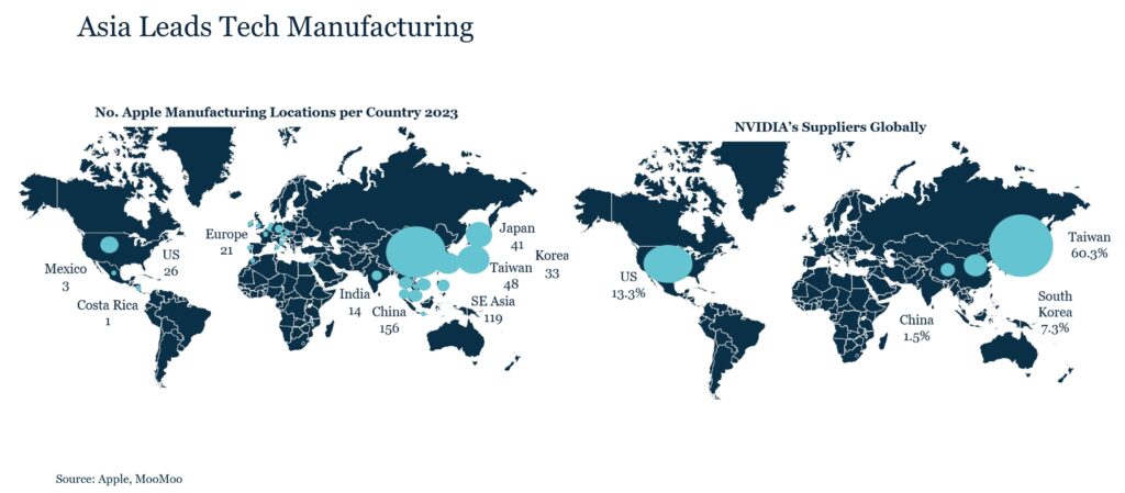 Given this trajectory it is unsurprising the technology has been a major driver of investment this year. However, there are and will continue to be losers as well as winners in the AI story. The key is not only recognising today’s obvious winners, companies like Nvidia, which now have the downside of increasingly expensive valuations, but also identifying undiscovered, innovative companies with competitive edges that play lesser known, yet vital roles in the Gen-AI industry. Focusing on the semiconductor industry reveals that emerging markets are crucial for diversified exposure to the Gen-AI industry.